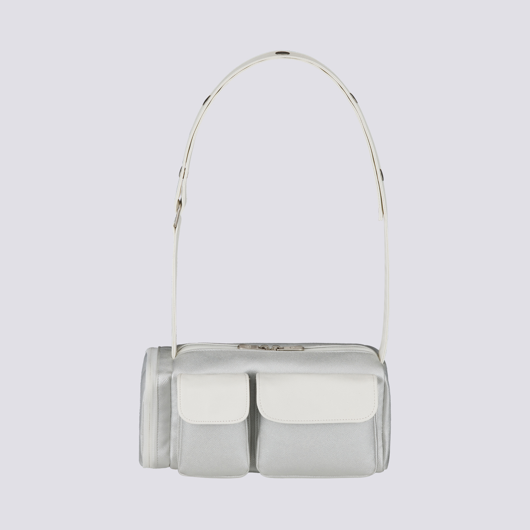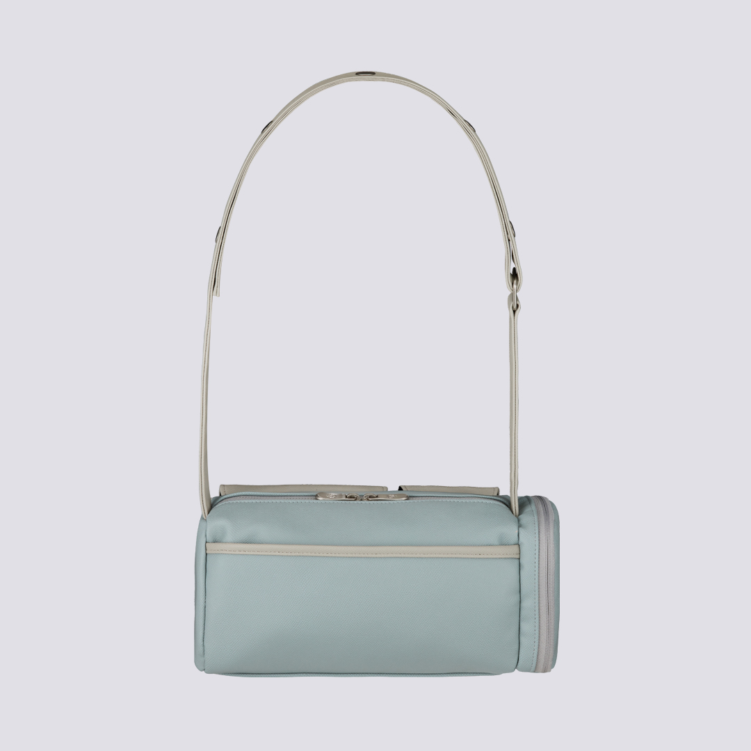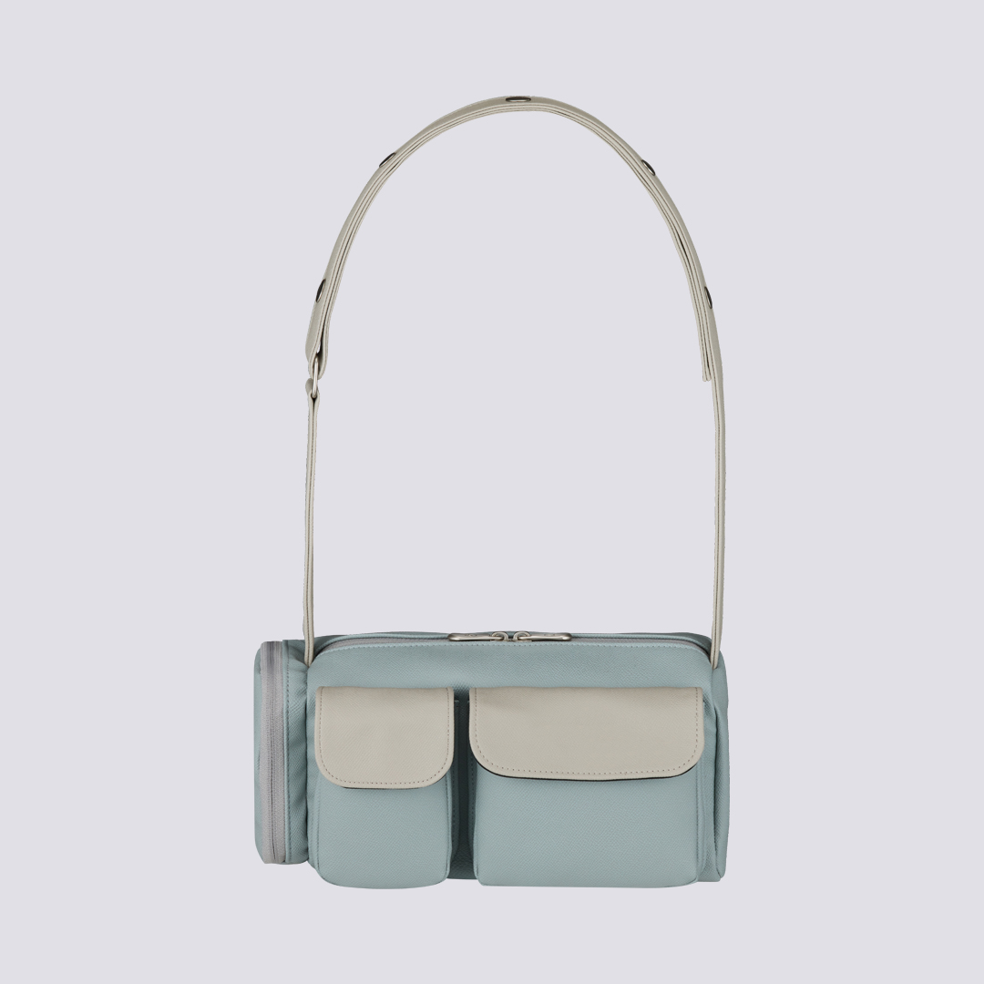 Remarks: A mini bag made from lightweight twill fabric featuring color blocking with a subtle sheen for a cool and refreshing style. The front utility pocket makes storage easy. The shoulder strap is adjustable.